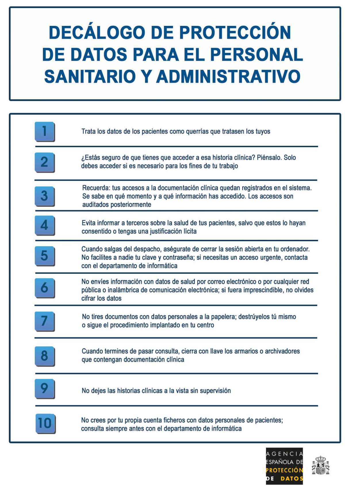 Puede consultar el decálogo de protección de datos para el personal sanitario y administrativo publicado en nuestra página web: